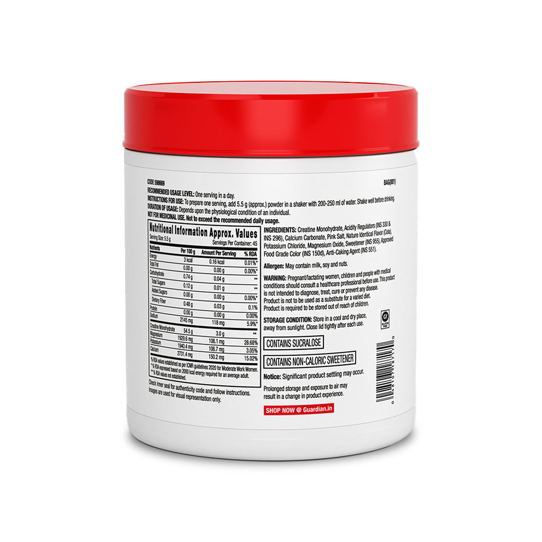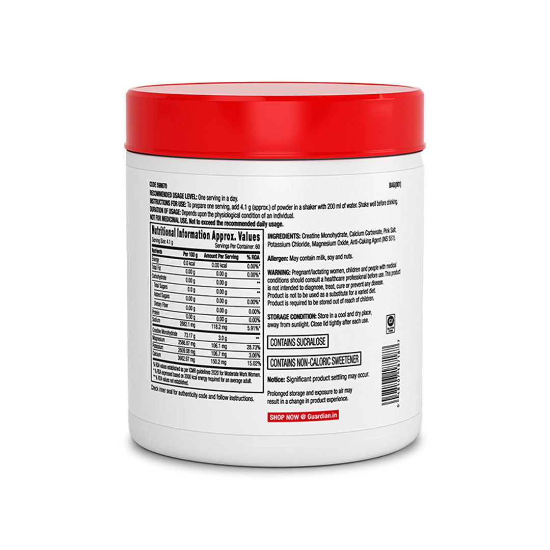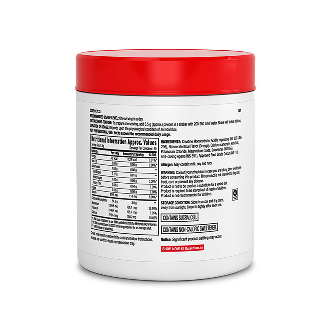 Creatine Monohydrate, Acidity Regulators, (INS 330 & INS 296), Nature Identical Flavor (Orange), Calcium Carbonate, Pink Salt, Potassium Chloride, Magnesium Oxide, Sweetener (INS955), Anti-Caking Agent (INS 551)