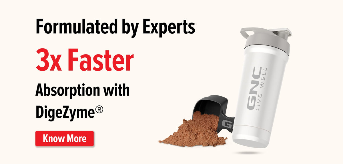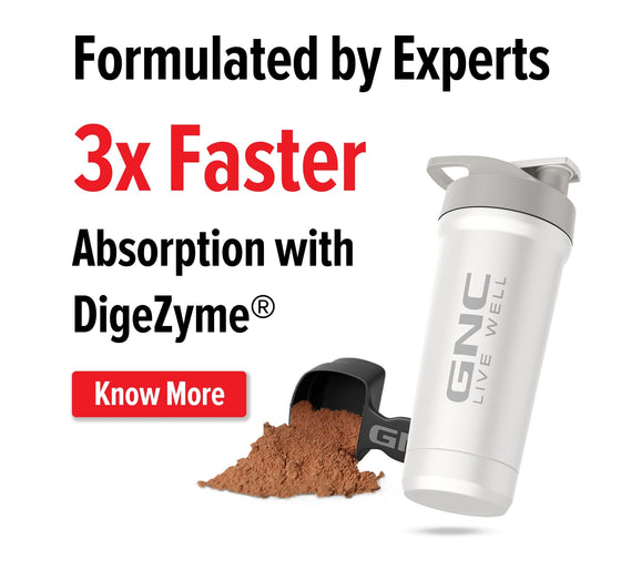 A: Most proteins take hours to break down. DigeZyme® is a blend of 6 digestive enzymes that speed absorption. It also boosts gut health by making digestion easier. Your muscles get nutrients when they need them, not hours later when the window's closed.