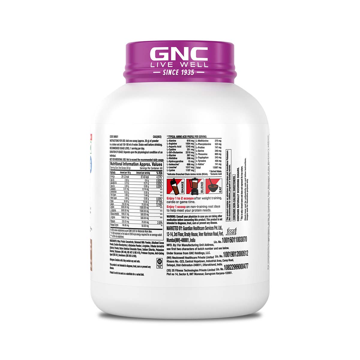 Whey Protein Concentrate, Skimmed Milk Powder, Alkalized Cocoa Powder, Creatine Monohydrate, L-Glutamine, L-Arginine, Tribulus terrestris (Gokhru) Powder, Nature Identical Chocolate Flavour, Sodium Chloride, Pro-Hydrolase Protease Enzyme, Thickeners (INS 415, INS 466 & INS 407), Potassium Chloride, Anti Caking Agent (INS 551), Sweeteners (INS 955 & INS 950).